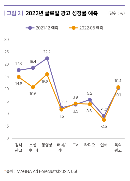 먼저, 경제적인 환경이다. 바이러스뿐만 아니라 전쟁 등으로 인한 경제적 문제가 대두되면서, 경기 침체나 불황에 대한 걱정이 커지고 있다. 이로 인해 광고비가 삭감될 것이란 전망도 있으나, 리서치 기업 Insider Intelligence나 컨설팅 기업 Magnaglobal 등은 지난해 예측 대비 성장률이 다소 줄어들 수는 있으나, 팬데믹 초기와 달리 기업들이 광고비 지출을 유지하거나 오히려 늘리면서 전반적인 광고비 규모가 성장세를 유지할 것으로 전망했다. 특히, 소비재 중심의 광고비 감소를 여행이나 테마파크, 영화 등 리오프닝 업계의 광고비 증가가 뛰어넘으면서 전반적인 광고 규모는 증대될 것이라는 해석이다.