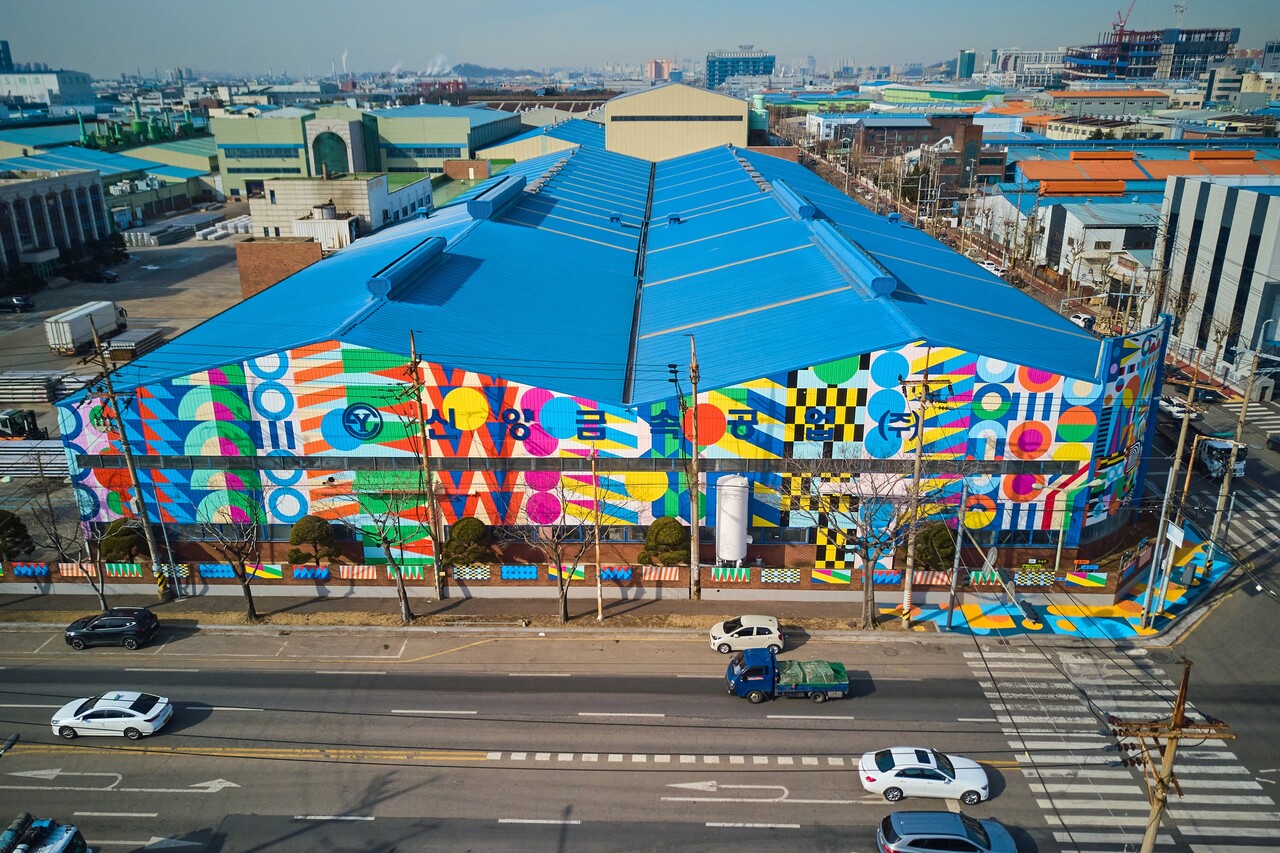 이런 ‘IBK예술로’ 프로젝트에는 설치, 퍼포먼스, 영상 등 폭넓은 매체를 통해 활약하고 있는 빠키 작가가 참여했다. 빠키 작가는 형형색색의 도형들을 기하학적인 패턴으로 시각화해 공장과 외부 사거리에 페인팅 작업을 진행하였다.
