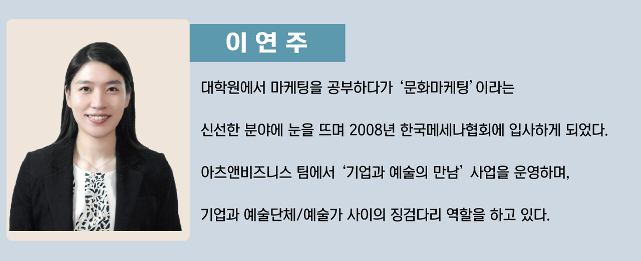 오늘 소개한 ‘1기업 1미술작가 지원 사업’은 미술계의 미래를 향한 ESG+메세나의 작은 시작이자 큰 문화투자임이 분명하다. 어느 예술 분야이던지 예술가·예술단체에 대한 기업들의 꾸준한 관심과 지원은 이들의 예술적 성취를 더욱 드높일 수 있는 감사한 원동력이 될 것이다.