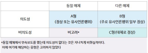 보다 간명한 판별을 위해 우선, ‘매체의 동일성’과 ‘의도성’이라는 두 가지 요소를 토대로 유형별 분류를 시도해보았다. ‘매체의 동일성’은 연속보도를 한 매체가 하나의 동일 매체인지, 아니면 상이한 매체들인지를 의미하고, ‘의도성’이란 연속보도가 기획된 것인지, 아니면 우연의 일치로 이루어졌는지 여부다.
