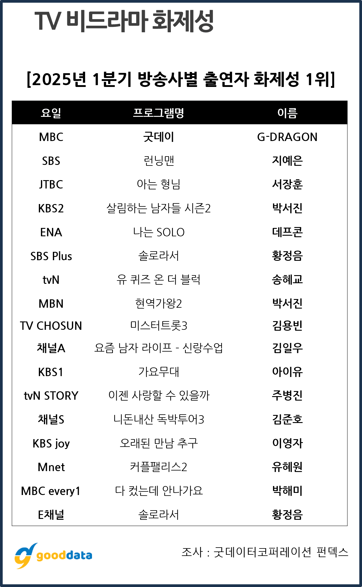 '굿데이'의 지드래곤은 2025년 1분기 최고의 화제성 점수를 기록한 출연자로 나타났다. 지드래곤은 프로그램에 출연하는 둥안 TV-OTT 비드라마 출연자 부문 1위 2회를 비롯 TOP5에 총 8회에 진입하는 인기를 보여줬다.